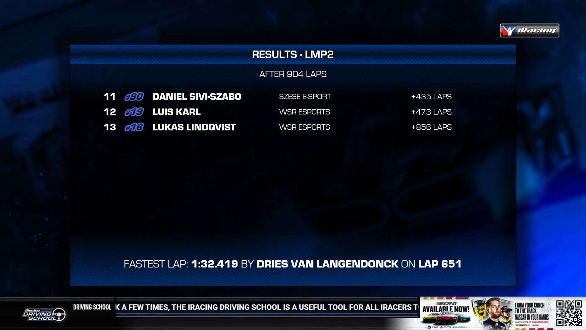 The LMP2 class was won by #003 Grid-and-Go.com eSports, driven by Aleix Nogué, Jesse Telkkälä, Balazs Remenyik, and Peter Zuba.