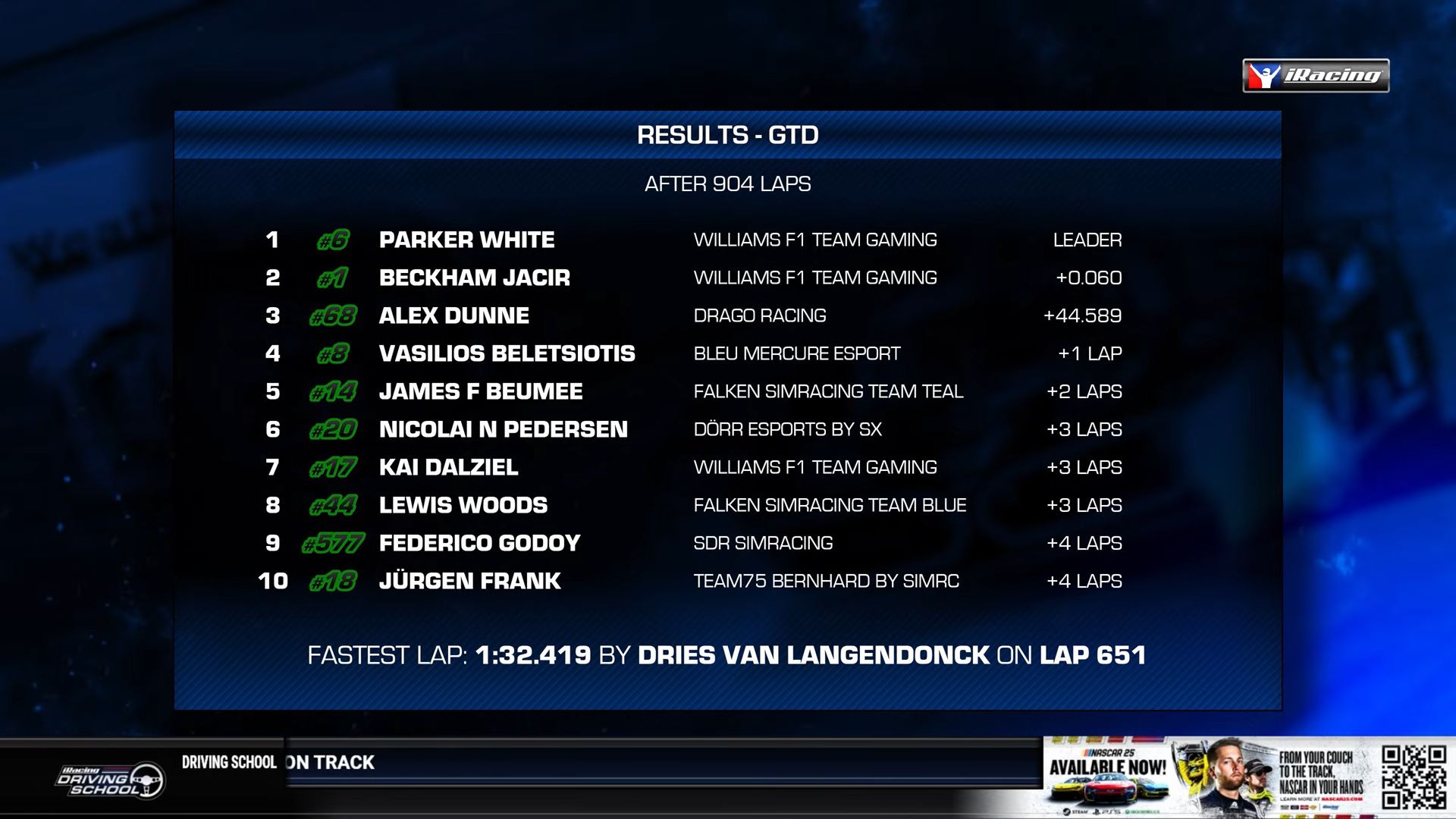 The slower but no less challenging GTD class was won by the #6 Williams F1 Team Gaming, driven by Parker White, Matias Orjuela, and Matteo Kuenzer. The #1 from the same team closely followed in second place.
