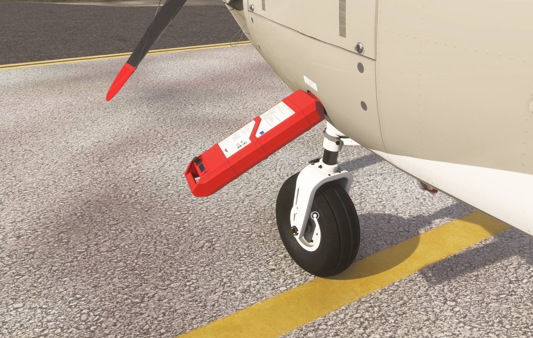 - NEW – Functional exterior elements (interactive in MSFS 2024) and control locks: chocks, pitot covers, engine covers, rudder lock and ground power cart. Pitot flags blow in the wind.