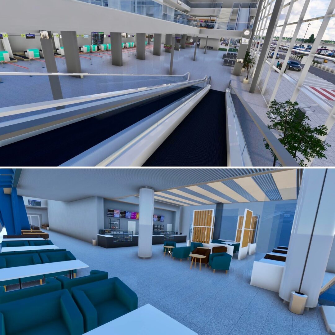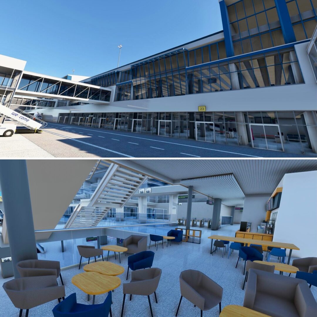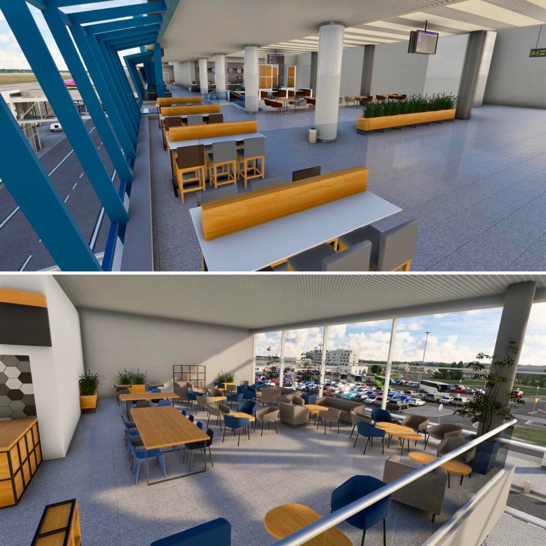 Inside the terminal, new gates, seating zones, cafés, and waiting areas have been completed, along with custom-made furniture, plants, and interior décor. Each element — from benches and tables to trash bins and signage — has been handcrafted and placed to match real-world layouts. The second-floor café now features new furniture sets and planters, creating a distinctive atmosphere for travelers and visitors.