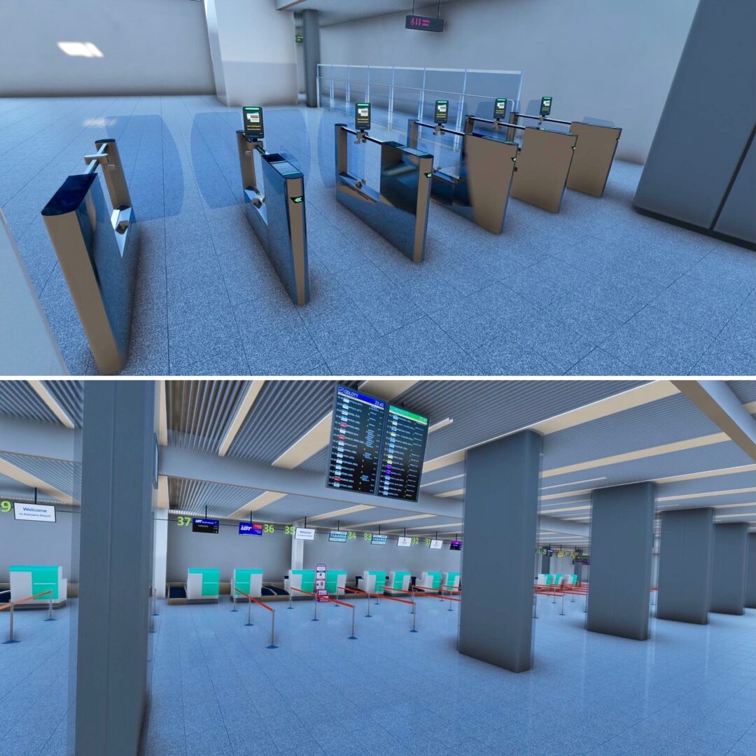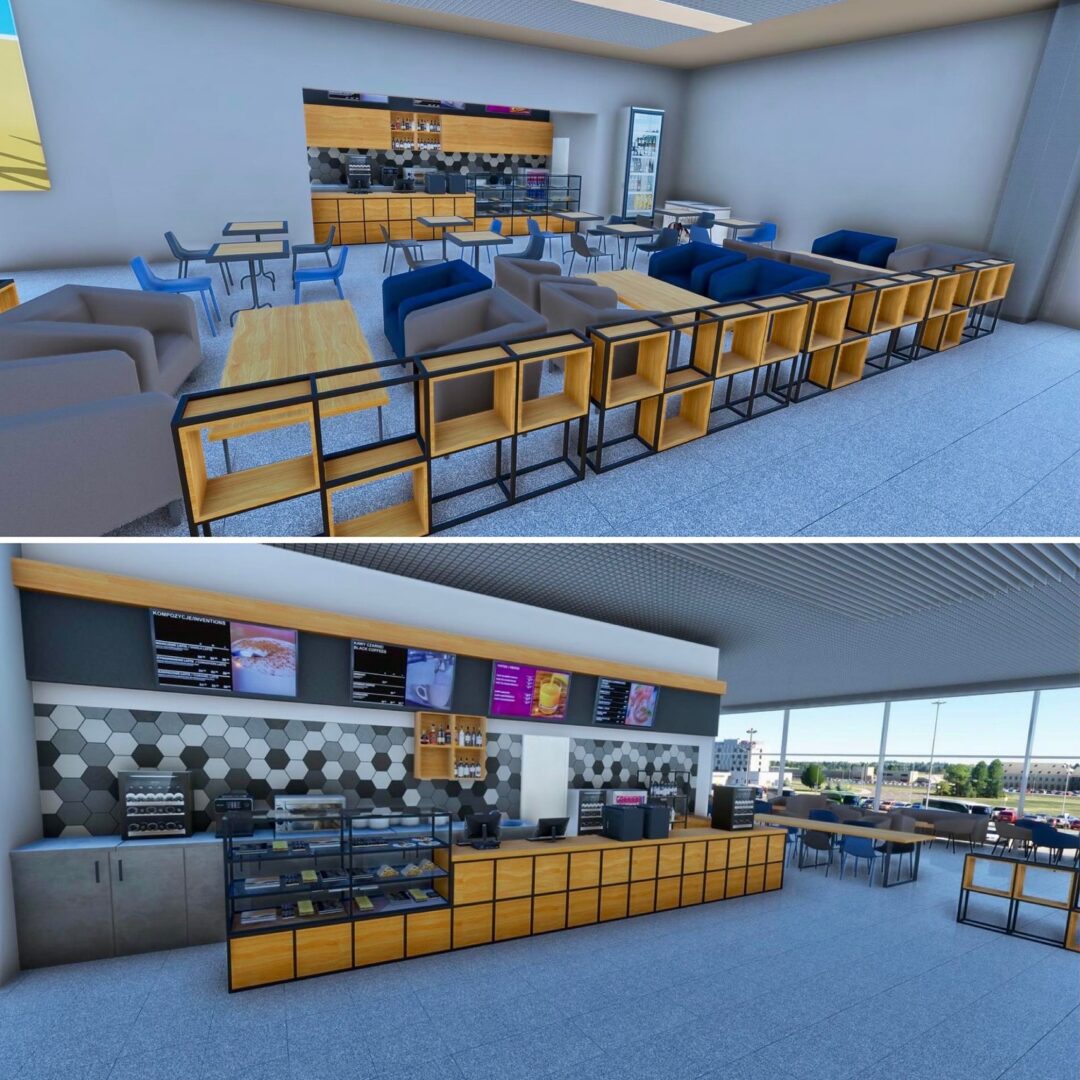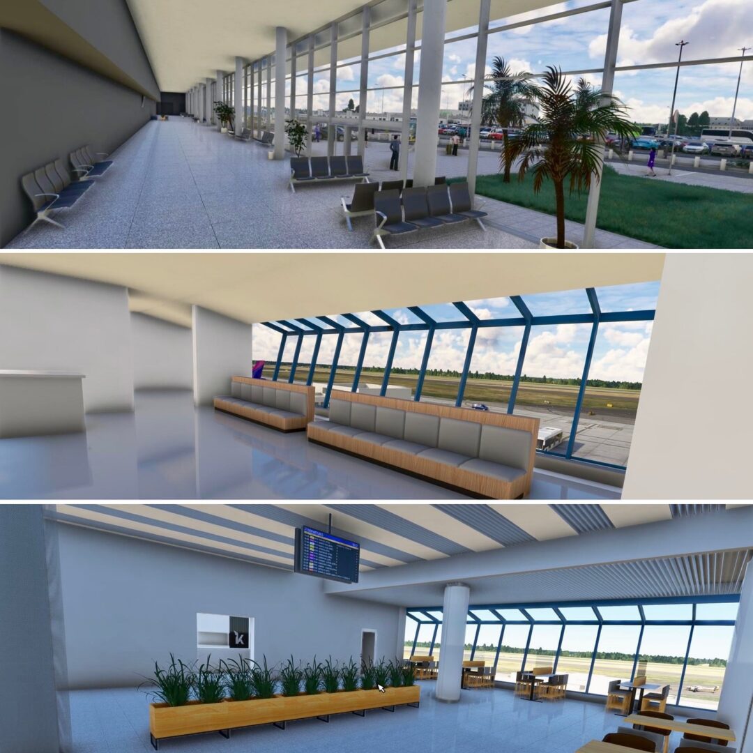 Inside the terminal, new gates, seating zones, cafés, and waiting areas have been completed, along with custom-made furniture, plants, and interior décor. Each element — from benches and tables to trash bins and signage — has been handcrafted and placed to match real-world layouts. The second-floor café now features new furniture sets and planters, creating a distinctive atmosphere for travelers and visitors.